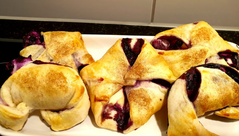 Blätterteig ausrollen und nach Belieben portionieren. Alle Zutaten, ausser die Beeren, miteinander vermengen. Die Creme auf den Blätterteig streichen. Anschliessende die Blaubeeren darüber verteilen. Den gefüllten Blätterteig zu Hörnchen oder Taschen formen. Mit einem Ei-Milchgemisch bestreichen und den Zimt & Zucker darüber streuen.